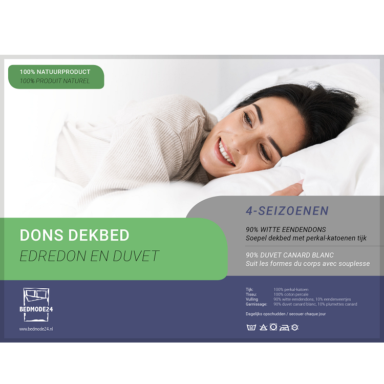 Dons is een heerlijk zacht en natuurlijk materiaal, wat lekker over je heen valt, ook blijft de vulling perfect op zijn plaats doordat het volledige dekbed door is gestikt.