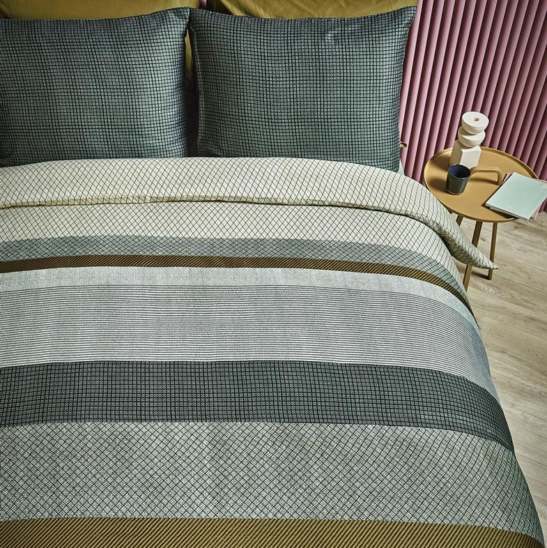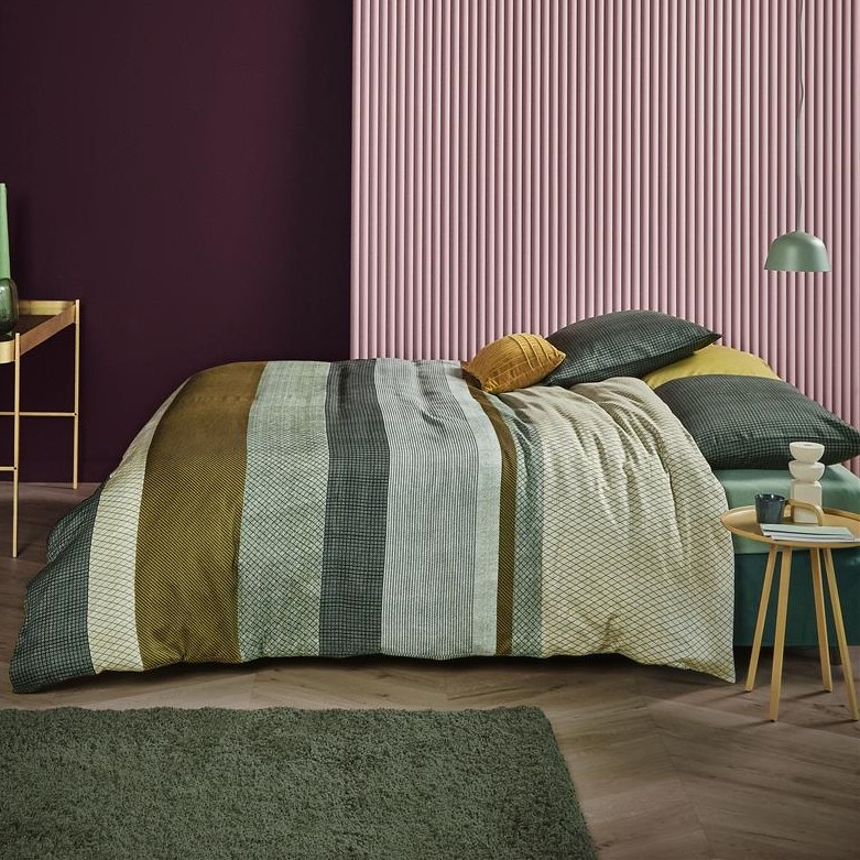 Dekbedovertrek Kyle Green is zowel sfeervol als modern. Het overtrek is verdeeld in verschillende banen met weefstructuren die bestaan uit diverse grafische motieven zoals ruitjes, wiebers en strepen. De ondergrond heeft een geweven structuur en geeft het overtrek een stoere uitstraling. Door de satijnweving krijgt het overtrek een chique glans.