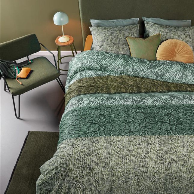 De banen met verschillende slangenprints maken het dekbedovertrek Beddinghouse Skin Green uniek. Dit overtrek gaat helemaal op in een moderne en sfeervolle slaapkamer.